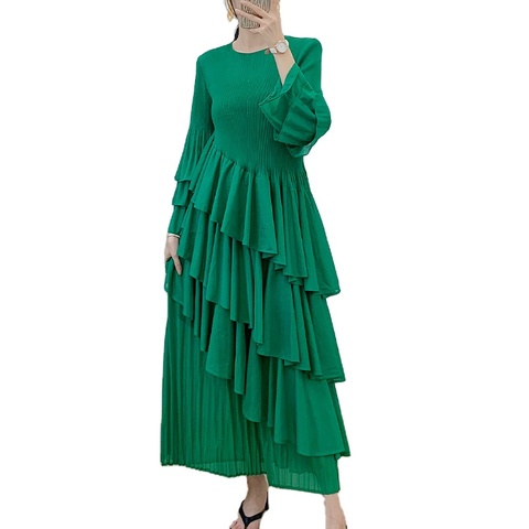 فستان ماكسي ميياكي مطوي بأكمام مكشكشة جديد لعام 2025 بحافة غير متماثلة أنيق وعصري للنساء بأسلوب احتفالي لعيد الميلاد