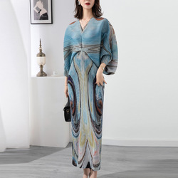 2024 yeni pilili top elbise baskı uzun kollu Maxi elbise pilili Miyake elbiseler kadınlar zarif
